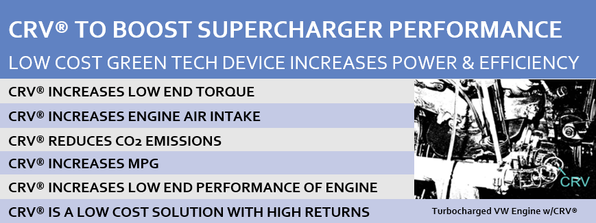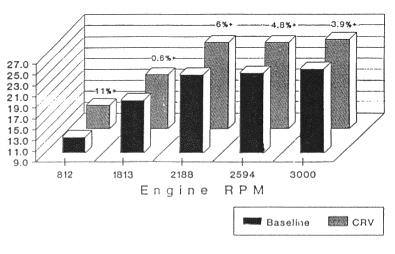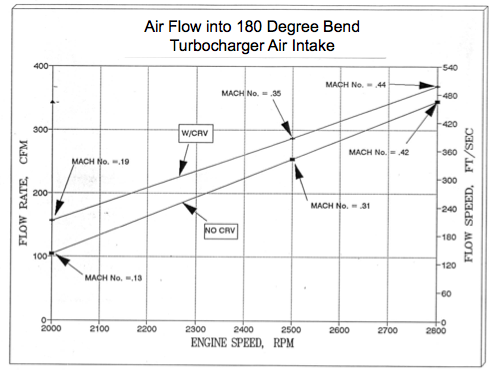 CRV® removes the distorted airflow to the inlet of turbochargers, caused by cramped space under the hood. The experiment shown was conducted on a turbocharged 40 hp VW rabbit diesel engine by inserting a CRV®, in the intake manifold. The measurement uses an airflow meter at the intake of the turbocharger to measure the inflow vs. rpm with and without a CRV®. Addition of a CRV® to remove the inlet distortion shows that the air flow at lower rpm is substantially increased by as much as 50% at 2000 rpm, and was increased at 2800 rpm by an additional 5.3%. It substantially increased the low end performance of the diesel engine. Without this CRV® modification the airflow to the turbocharger is highly distorted where the turbocharger cannot perform at its best.