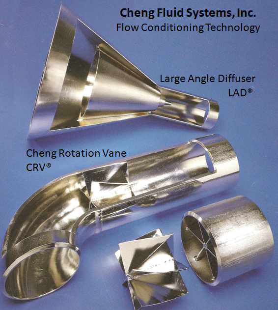 Part of the solution to a plant’s operating inefficiencies rests in the application of flow conditioning technology. The most advanced products in this area include two patented equipment designs, the Cheng Rotation Vane (CRV®) and the Large Angle Diffuser (LAD®), from Cheng Fluid Systems, Inc., that fit in line, have no moving parts, and are simple and cost effective.