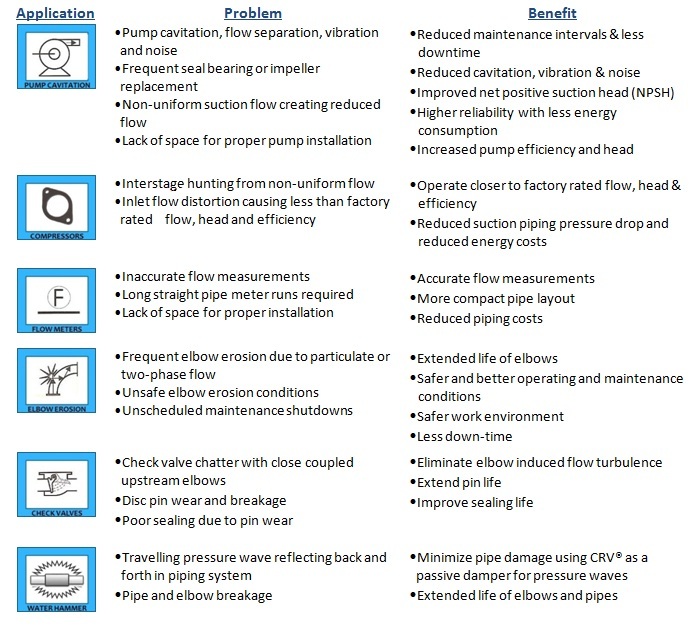 The Cheng Rotation Vane (CRV®) consists of a set of stationary vanes in a cylindrical body and is placed immediately upstream of an elbow in a piping system. CRV® vanes are specifically designed so that they impart a gyroscopic motion to the following fluid. This gyroscopic motion counteracts the rotating motion of the fluid that is produced by the elbow. The CRV® enables the fluid to negotiate the turn through the elbow and exit the elbow with a flat velocity uniform velocity profile. Other flow benefits achieved when using a CRV® are a reduced pressure drop through an elbow, no fluid turbulence, less noise, less vibration and no fluid separation. The CRV® improves the flow of fluid through any type of elbow and thus turns the elbow into the equivalent of a straight length of pipe.