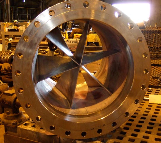 Flow conditioner is to be located directly at elbow inlet, within the vicinity of the upstream piping turn entrance and will rotate the fluid through the turn such that it exits the turn with a flat velocity profile. The flow conditioner shall have a zero angle of attack at the entrance and an aerodynamic shape such that it produces minimal pressure drop, if any depending on the application, fluid properties and velocity. The flow conditioner internals are to be stationary and welded/flanged to the pipe-stub housing. Available in 2" through 72" and larger at request.
