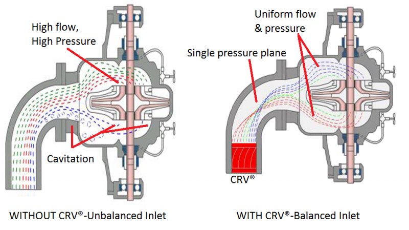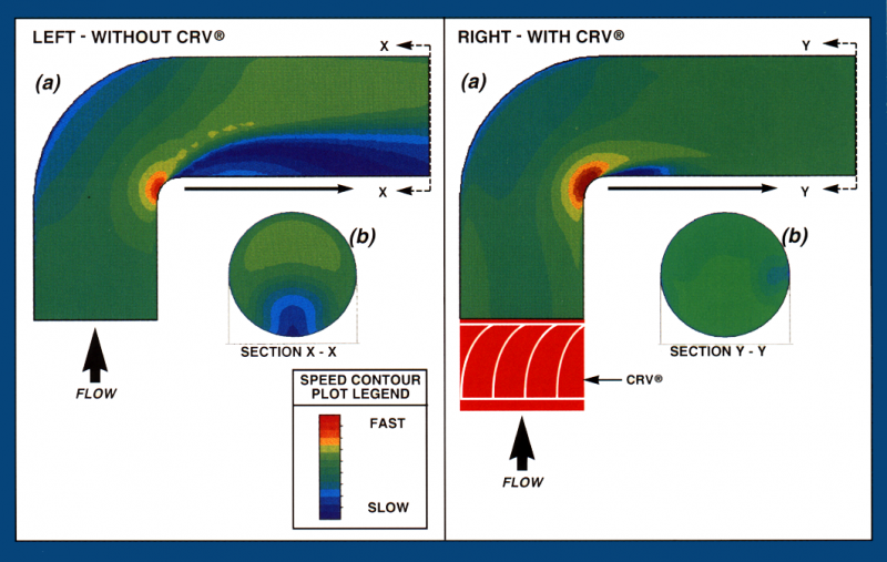 When a fluid travels through an elbow or curved conduit in a piping system, it becomes turbulent. The flow stream next to the outer radius must travel a longer distance than the flow stream near the center. When this happens, the pressure distribution becomes uneven and the fluid separates into numerous secondary flows that swirl, rotate and have accelerated/reverse flows. Thus, the velocity pattern at the exit of the elbow becomes turbulent. This is the reason why a curved conduit can produce a greater pressure loss than a straight section of pipe. This flow turbulence will continue downstream from the elbow and will be detrimental to the operation of rotating equipment connected within 10 pipe diameters of the bend. The Cheng Rotation Vane (CRV®) was invented to eliminate the flow turbulence caused by an elbow or bend in a piping system.